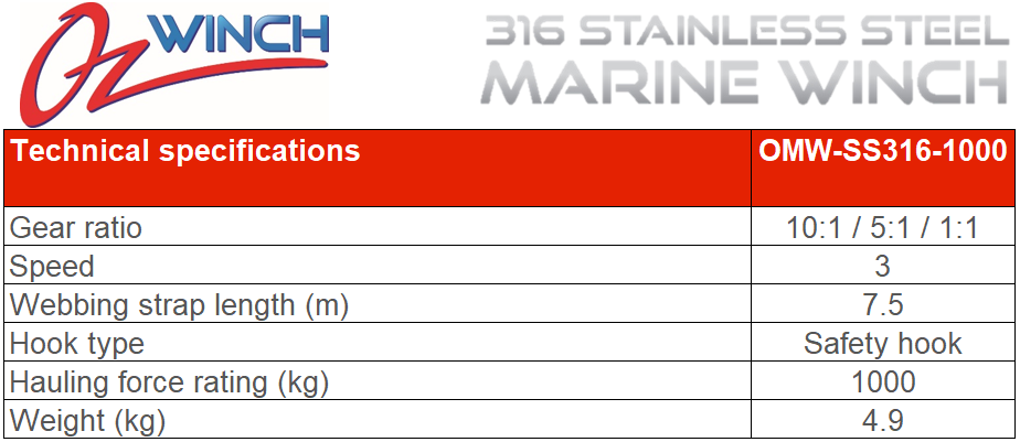 OzWinch 316 Stainless Steel Marine Winch Three Speed 1000kg